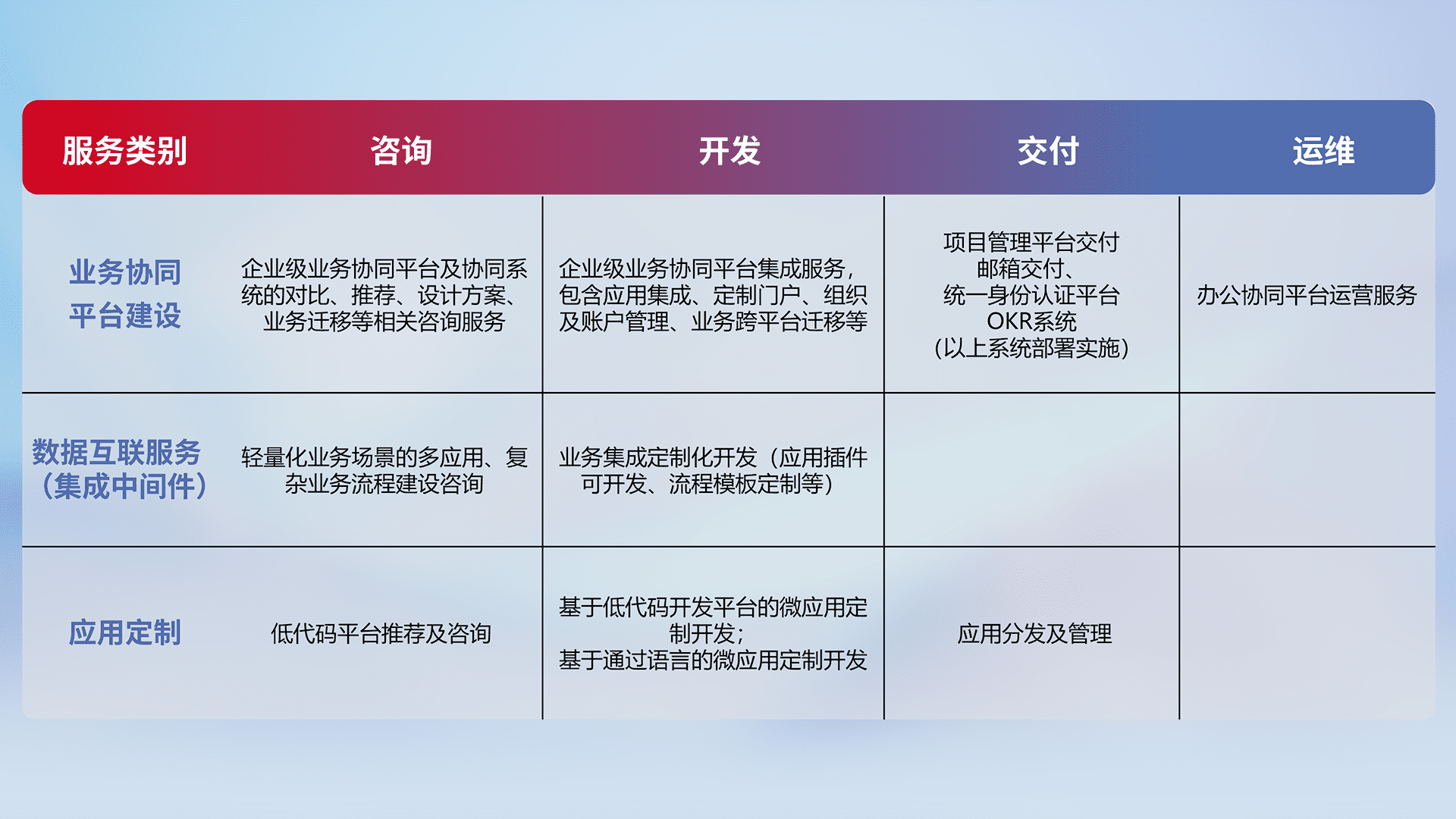 针对钉钉、、企微、、IDaas等平台级产品提供产品的规划、、方案、、、交付、、、、定制化开发等服务,,,,实现如统一协同办公、、智能客户服务、、混合会议管理、、、智能数据查询、、等业务场景,,,实现数字化转型。。。。